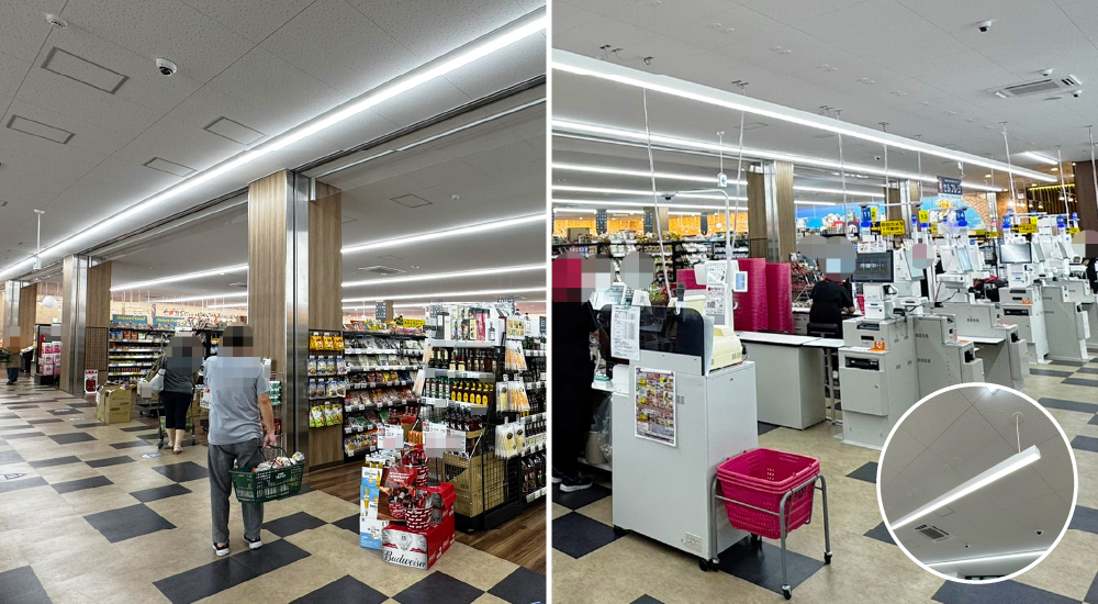 ペンダントタイプのライン照明を、レジコーナーの上にポイント使いで導入されました。