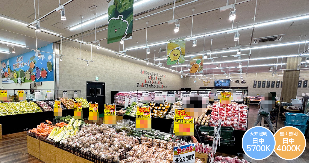 高品質で種類豊富な地場食材を引き立てるスポットライトには、生鮮食品専用の光色をカテゴリ毎にお選びいただきました。
