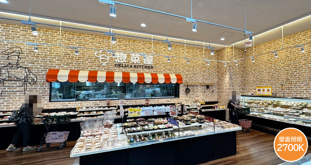 惣菜売場はレンガ調の内装に合わせたより低色温度の壁面照明と、店内調理の惣菜の出来立て感を引き立てる光色のスポットライトをご採用いただき、他の売場と比べてあたたかい印象の食卓をイメージさせる売場となりました。(デリカナチュラル)