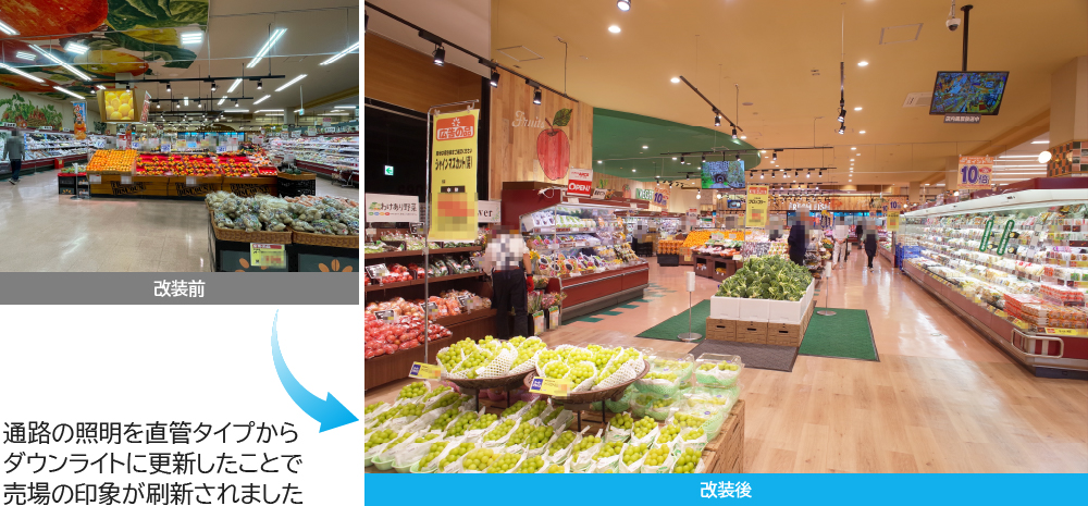 照明を更新したことで、売場のリニューアル効果が高まったとお喜びいただきました。