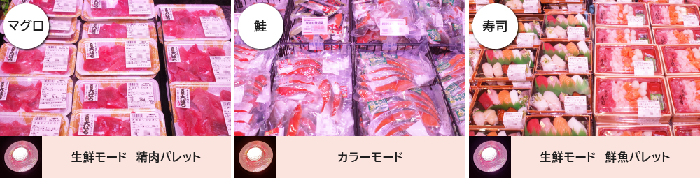 マグロ、鮭、寿司以外の鮮魚食材には生鮮食品専用照明FreshDeliシリーズをご採用いただきました。(フレッシュE)