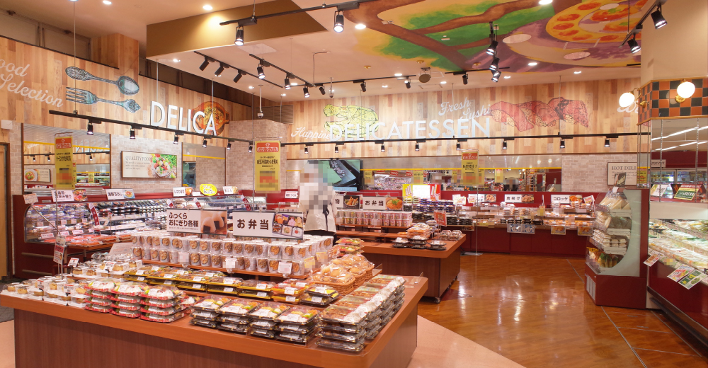 手作り・出来立てに拘った道南ラルズ様最大の品揃えの惣菜売場では、スポットライトの自然な光色で美味しさを引き立てています。(フレッシュN)