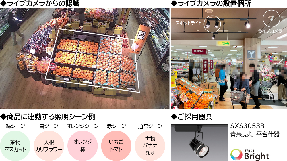 店内のライブカメラからAIで売場を認識し、商品に合わせて光色を変更することで商品の良さをさらに引き立てます。