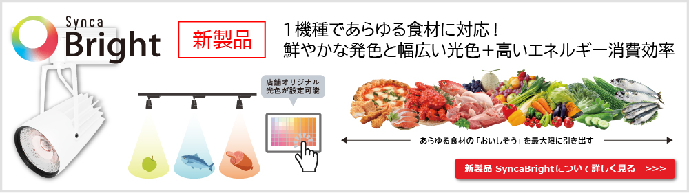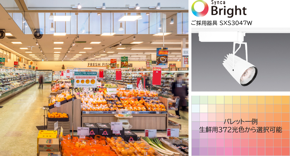 売場全体に372光色から選べる生鮮用スポットライト 「Synca Bright」 をご採用いただきました。