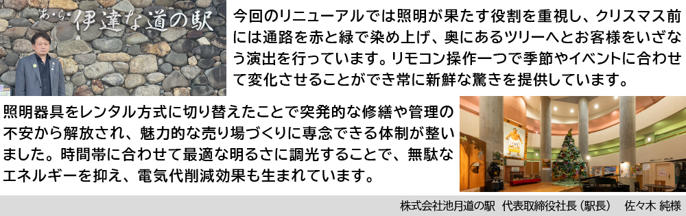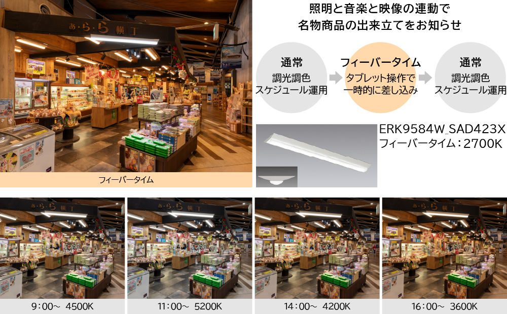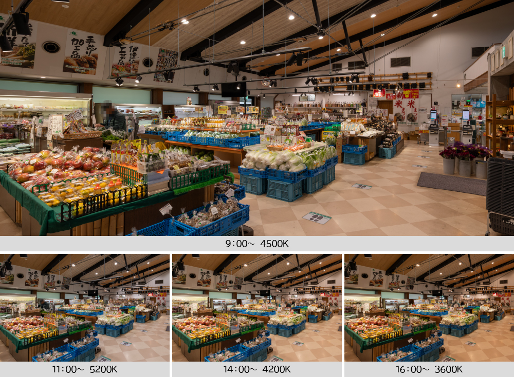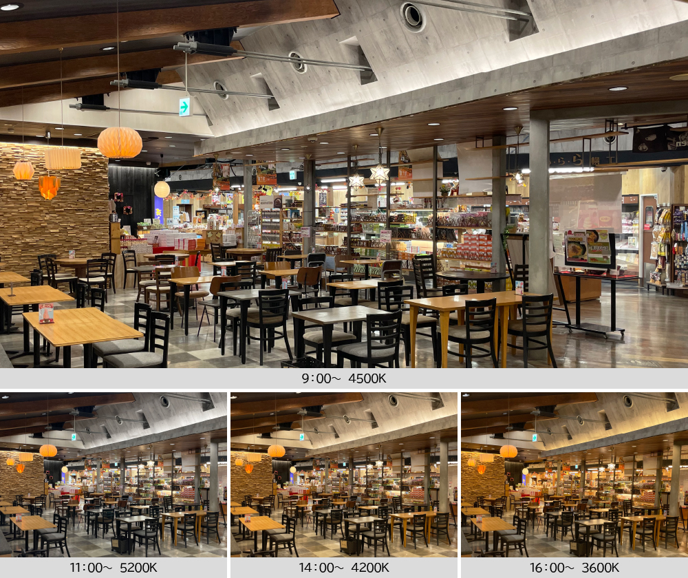 時間帯に合わせて施設全体の天井照明の光色と明るさを制御することで、居心地の良い売場づくりと省エネの両立をされました。