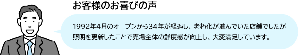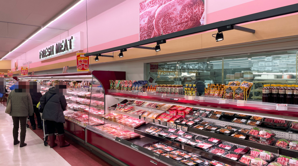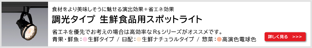 スポットライトは生鮮食品専用Rsシリーズをご採用いただきました。高いエネルギー消費効率に加え、スポットライトも時間帯に合わせて明るさを制御することで、さらに省エネ効果を高められています。