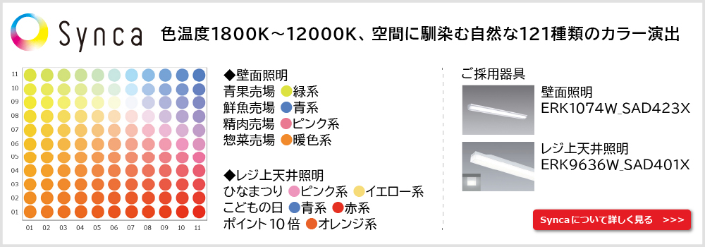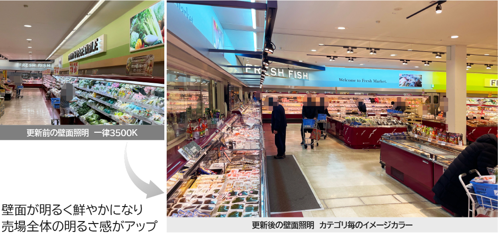 売場全体に調光調色タイプのLED照明をご採用いただき、時間帯に合わせてスケジュール運用をされています。