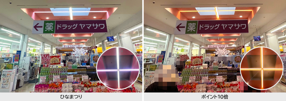 レジ上の天井照明は季節やイベントに合わせて光色を変化させることで、わくわく感を演出されています。